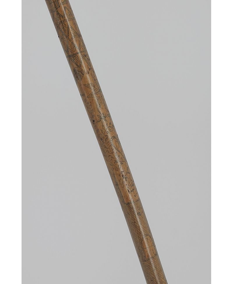 The drawing on the shaft represents women, men in 19th century fashion, sun, church, star, heart. A text in French : "Est-il bientôt parti Oui" (Is he gone ? Yes.)