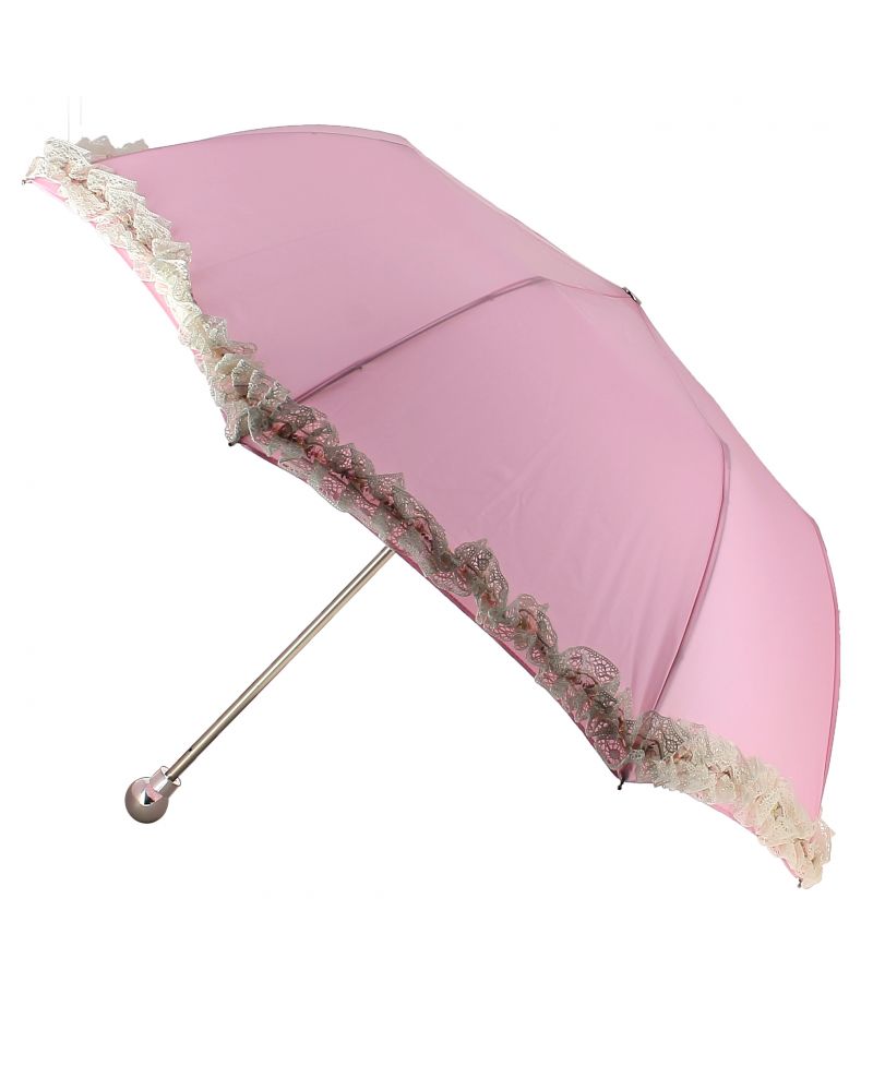 Parapluie pliant Dame, rose avec froufrou dentelle blanc pommeau boule en métal argenté